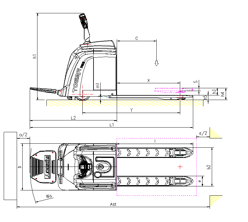 直角堆垛通道寬度,托盤(pán)800x1200(1200沿貨叉邊) | Ast mm | 2550 | |||